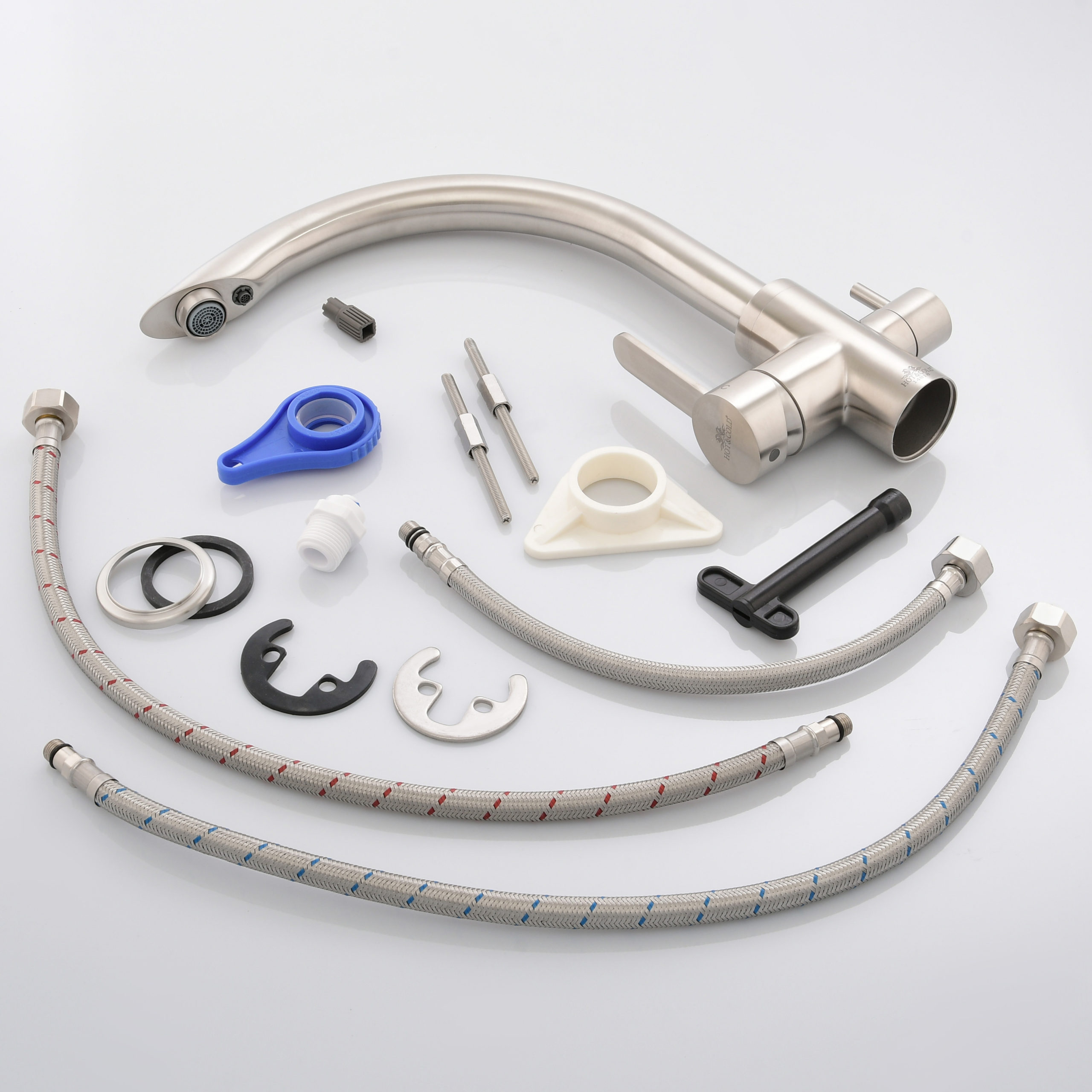 Инструкция, установочный ключ, сменный аэратор 1 шт, подводка 50 см ∅1/2 (3 штуки: для холодной и горячей воды, для фильтра)