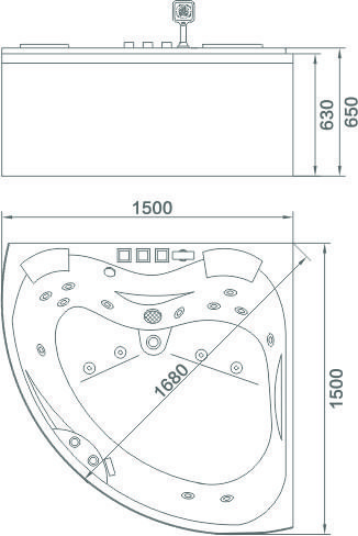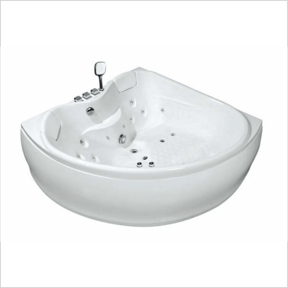Акриловая ванна с гидромассажем. • Чистый акрил, цвет белый • Сварной каркас из нержавеющей стали • Гидромассаж: 6 спинных форсунок, 4 донных форсунки, 2 форсунки в зоне ног • Встроенный смеситель с ручным душем, излив водопад • Пневматическое управление • Датчик уровня воды • Эргономичная форма дна, 2 белых подголовника