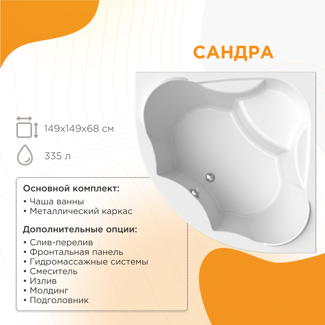Акриловая ванна "Сандра" 149х149 – треугольная угловая ванна, идеально подходящая для двоих: просторная, с двумя равно наклонными спинками и полноценным глубоким сиденьем. Благодаря своей вместительности ванна позволяет занять любую удобную позу, а плавные внутренние очертания и изгибы дарят ощущение гармонии и уюта. Модель имеет одинаковую длину и ширину пристенных бортов и отлично встает в один угол помещения, освобождая остальное место для прочей сантехники, мебели, стиральной и сушильной машины.