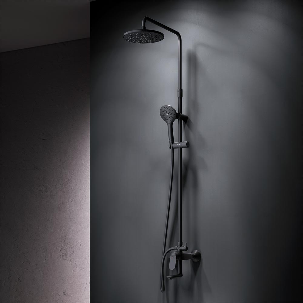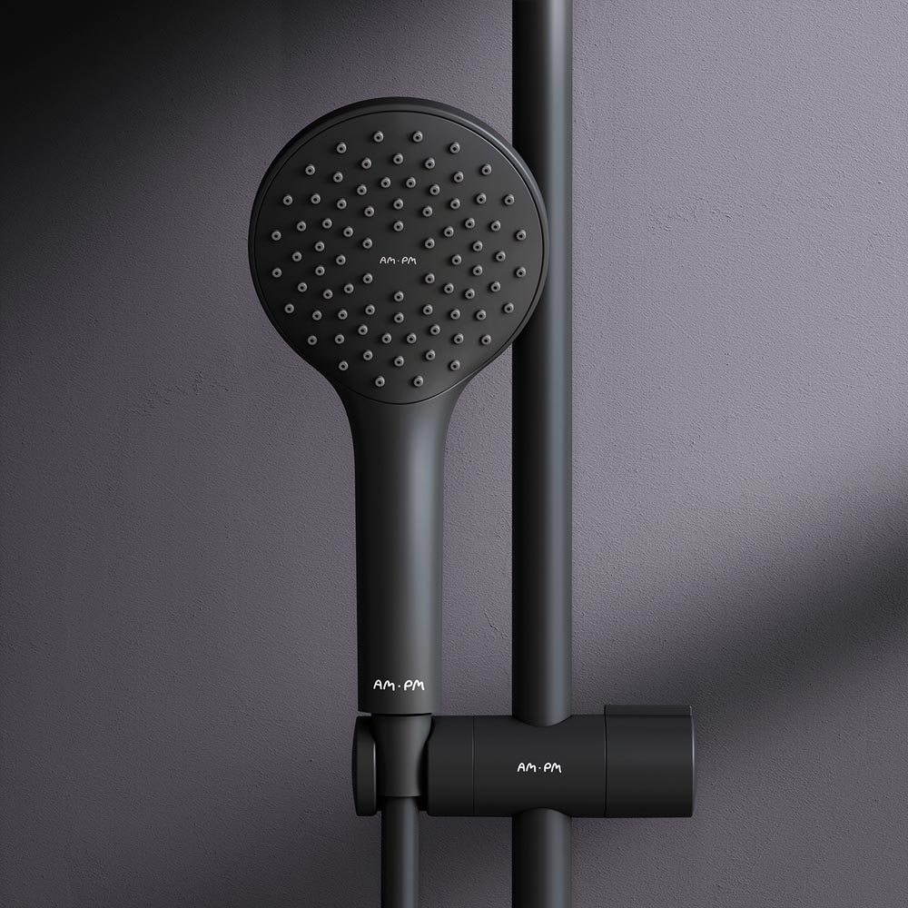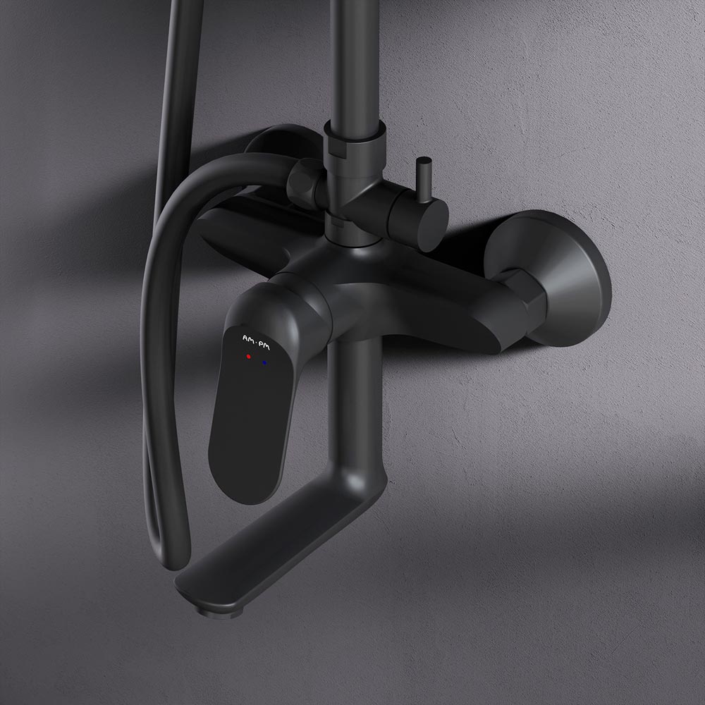 Душевая система от бренда AM.PM коллекции Sunny. Все детали душевой системы – от пропорций ручного и верхнего душей до рисунка расположения форсунок на лейках – подчинены единой дизайн-концепции. Цвет - черный матовый. Размер (Ш/Г/В): 220x552x1030-1460 мм. Материал душевой системы - латунь, ABS-пластик, нержавеющая сталь.