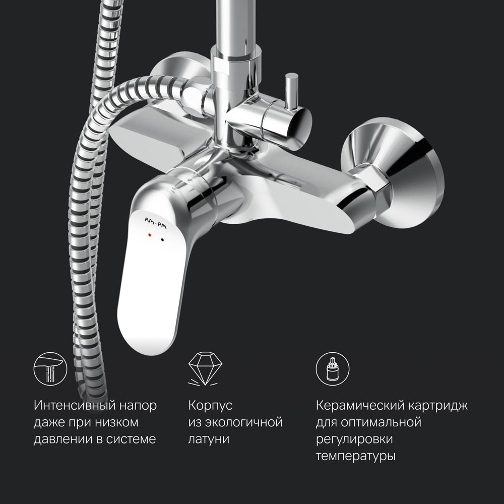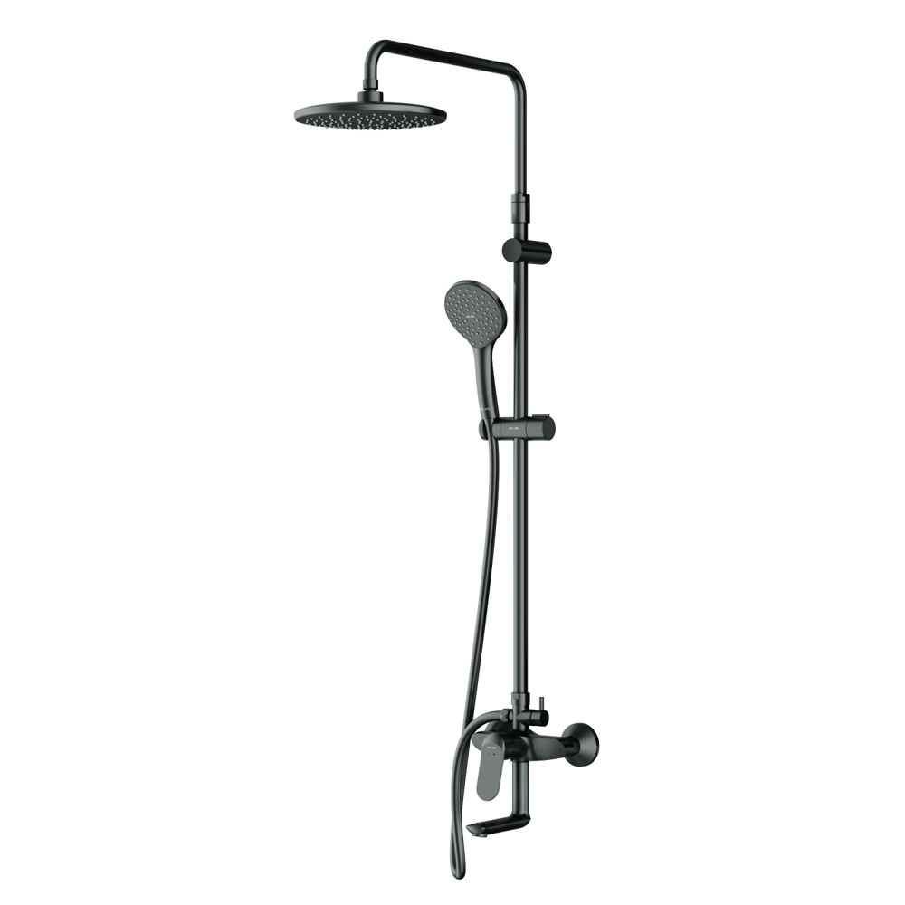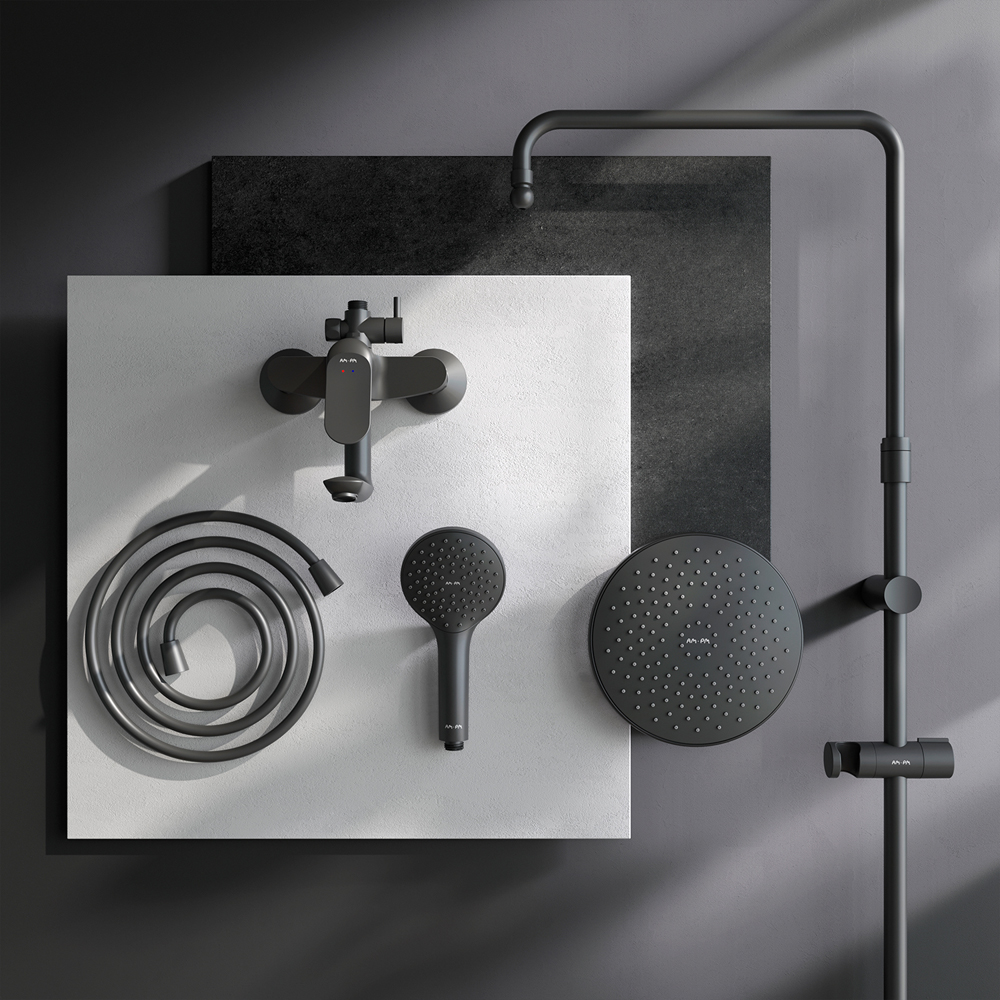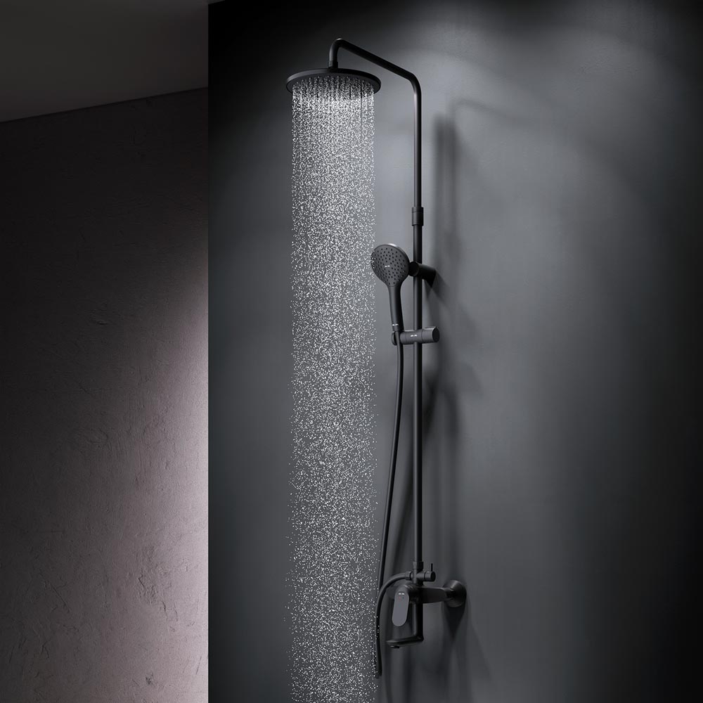 Душевая система от бренда AM.PM коллекции Sunny. Все детали душевой системы – от пропорций ручного и верхнего душей до рисунка расположения форсунок на лейках – подчинены единой дизайн-концепции. Цвет - черный матовый. Размер (Ш/Г/В): 220x552x1030-1460 мм. Материал душевой системы - латунь, ABS-пластик, нержавеющая сталь.