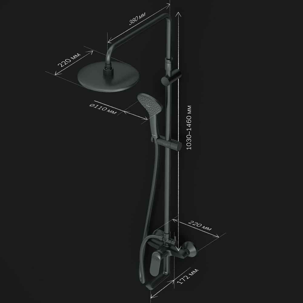 В комплектацию душевой системы входят: тропический душ, ручной душ, стильный смеситель с изливом, эксцентрики, держатели штанги и душа. Длина душевой штанги - 1030-1460 мм. Длина душевого шланга - 1750 мм. Размер ручного душа - 120 мм. Диаметр верхнего душа - 220 мм.