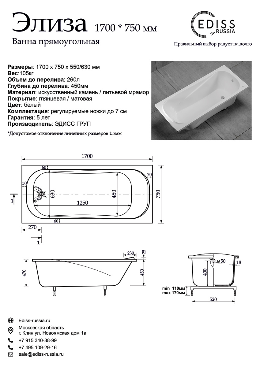 Ванна Ediss Элиза, 170х75, М-1775