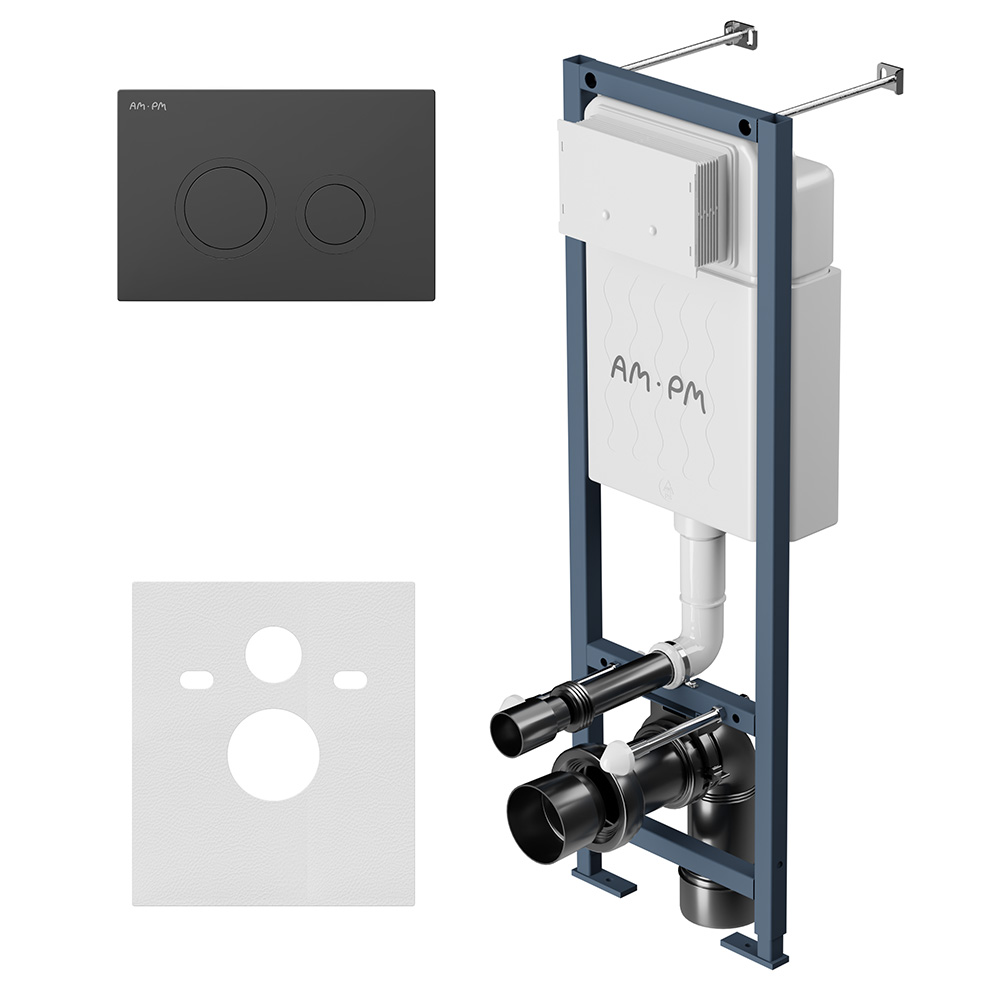 Инсталляция для подвесного унитаза бренда AM.PM коллекции ErgoFit с механическим управлением смыва поставляется вместе с полным комплектом: пачок, крепления, патрубки, звукоизолирующую прокладку. Размер инсталляции (Ш/Г/В): 352x150-265x1320 мм. Размер клавиши (Ш/Г/В): 250x10x160 мм. Цвет – синий каркас, белый пластик, механическая двухрежимная клавиша черная матовая. Форма кнопок: круглые. Материал инсталляции - нержавеющая сталь, ABS-пластик.
