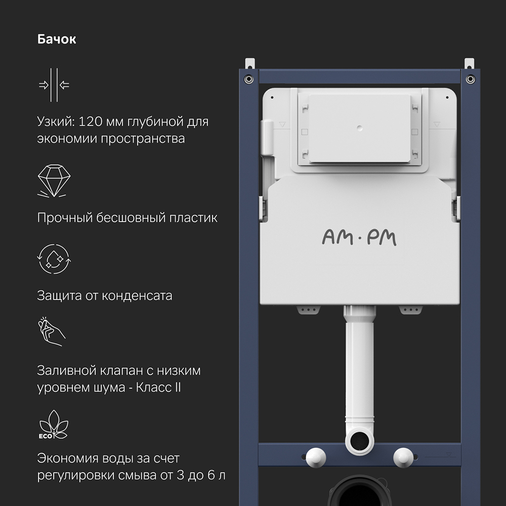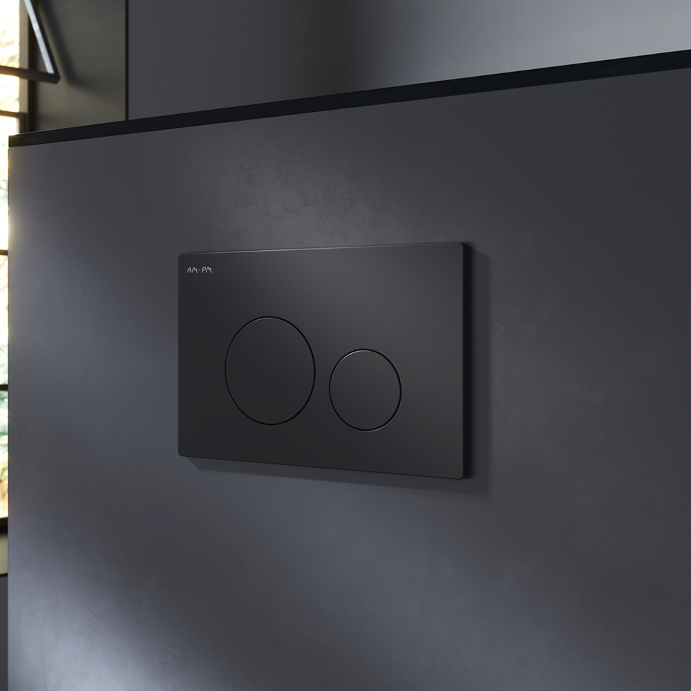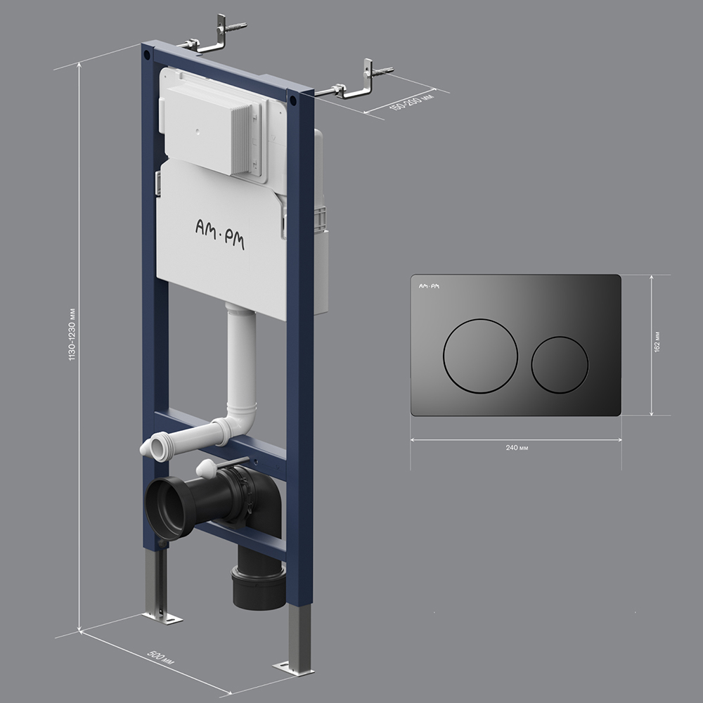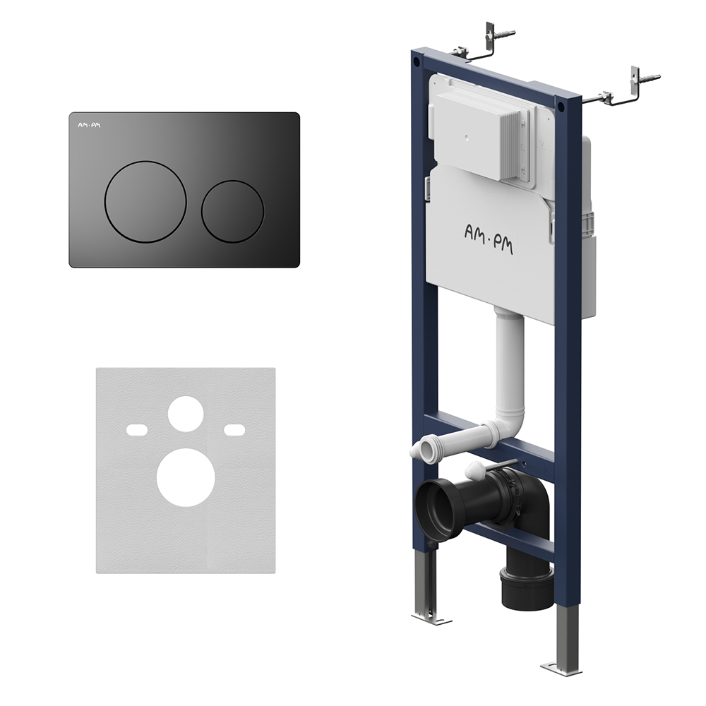 Инсталляция для подвесного унитаза бренда AM.PM коллекции PrimeFit с механическим управлением смыва включает в себя максимально полный комплект поставки: крепления, патрубки, звукоизолирующую прокладку, механическую двухрежимную клавишу смыва. Размер инсталляции(Ш/Г/В): 530x150-200x1130-1230 мм. Размер клавиши (Ш/Г/В): 240x10x162 мм. Цвет и материал: синий каркас из нержавеющей стали, белый бачок из ABS-пластика, механическая клавиша черная матовая. Форма кнопок: круглые.