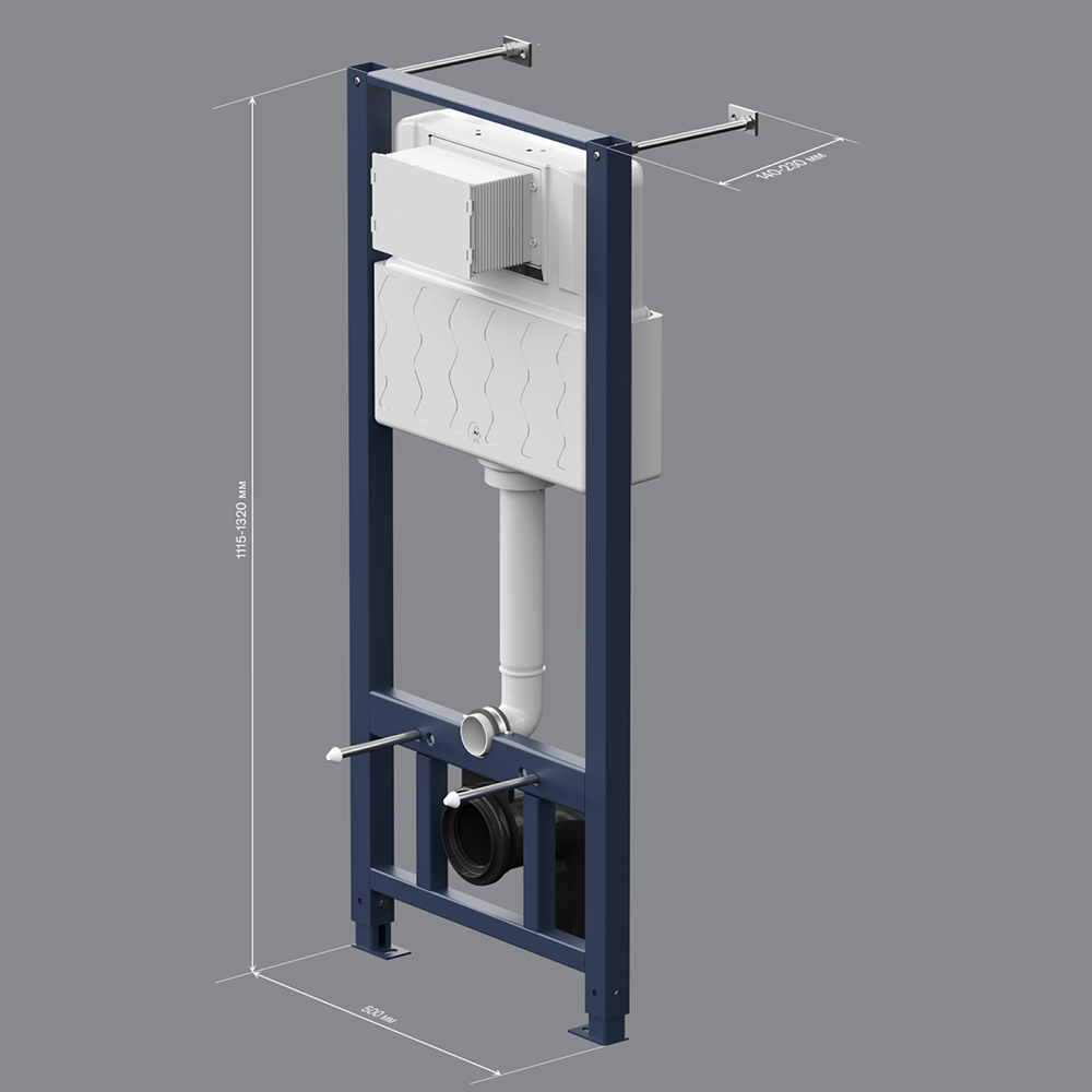 Инсталляция для подвесного унитаза бренда AM.PM коллекции Pro c пневматическим управлением смыва поставляется вместе с полным комплектом: все необходимые крепления, патрубки, звукоизолирующая прокладка. Размер изделия (Ш/Г/В): 500x140-230x1115-1320 мм. Цвет – синий каркас, белый пластик. Материал изделия - нержавеющая сталь, ABS-пластик.