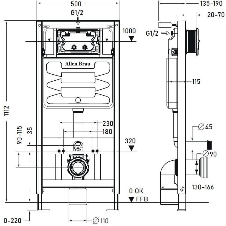 Размер от монтажной стены до чернового обрамления: 135-190мм + глубина клавиши 20-70мм