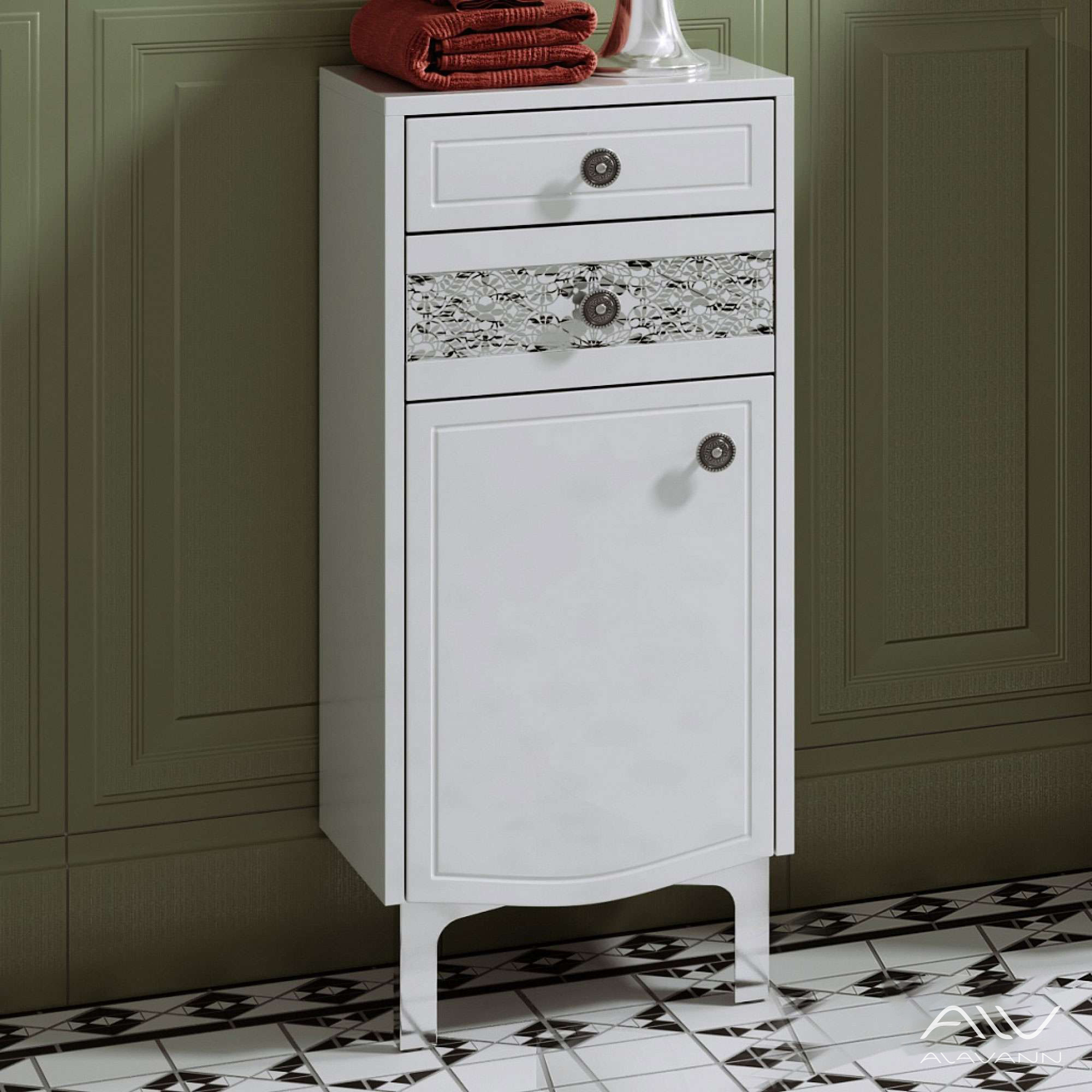 Комод для ванной Elizabeth 35 является дополнением к дизайнерской коллекции Elizabeth, идеально подходит к гарнитуру и воплощает в себе эстетическую красоту и функциональность. Комод окрашен и покрыт высокоглянцевой эмалью, которая предотвращает поверхность от воздействия влаги и гарантирует не только влагостойкость, но и долгий срок эксплуатации мебели. Фасады на доводчиках плавного закрывания.