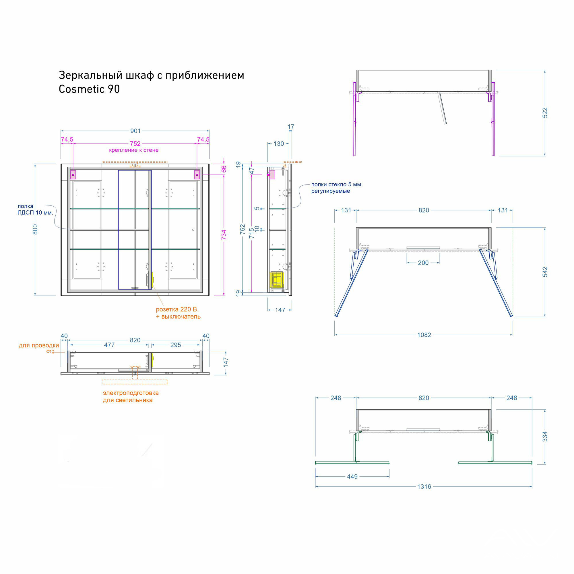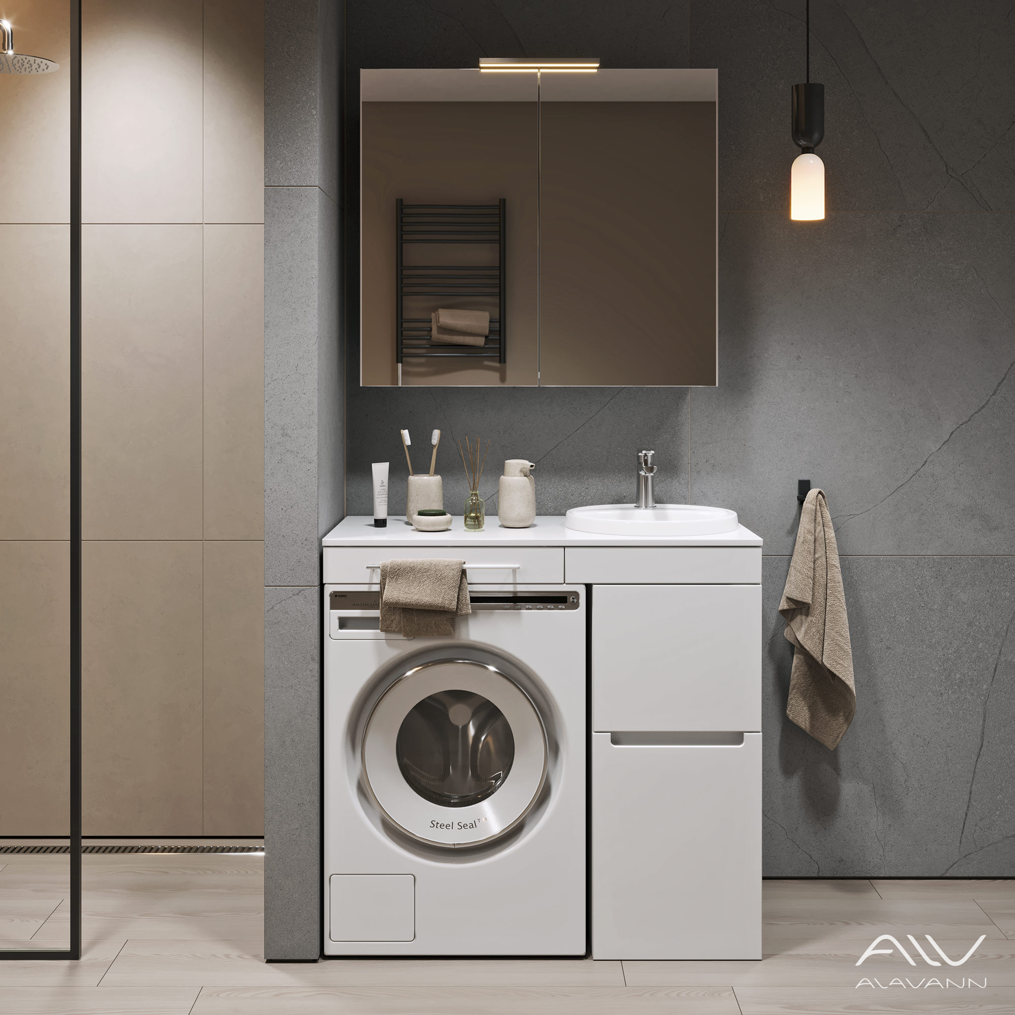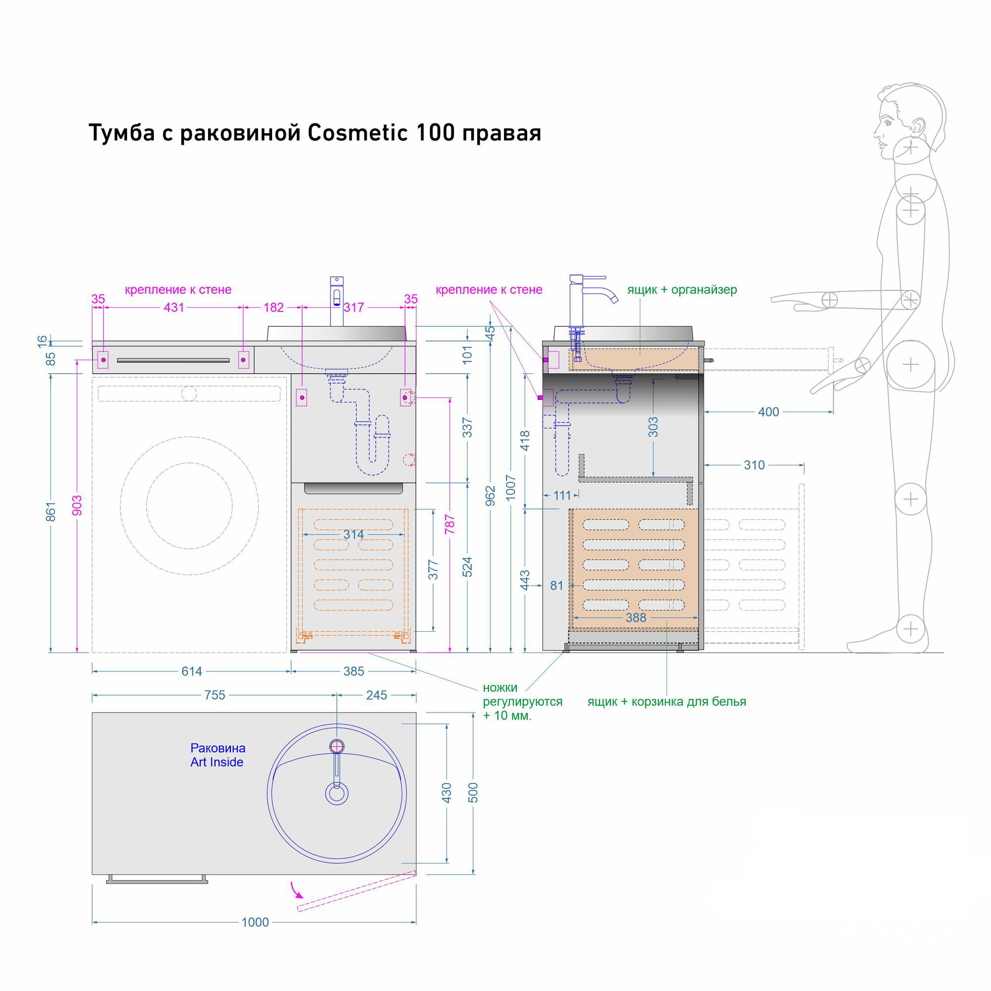Комплект мебели для ванной «Косметик» выпускается в размере 100 см, благодаря чему подходит под стиральную машину любых габаритов.