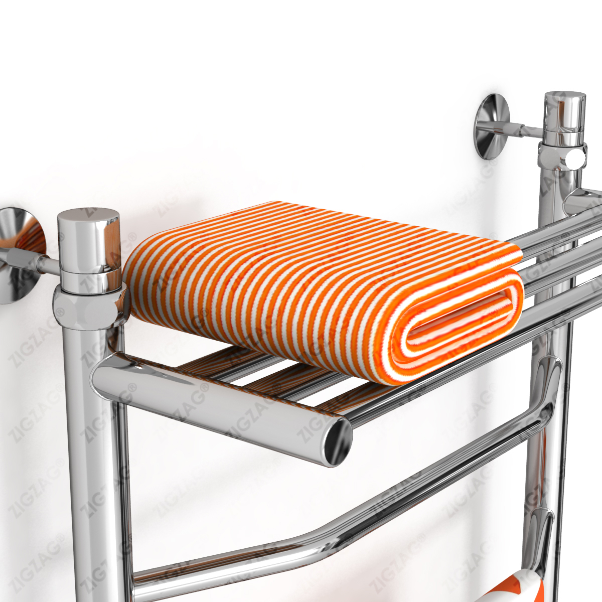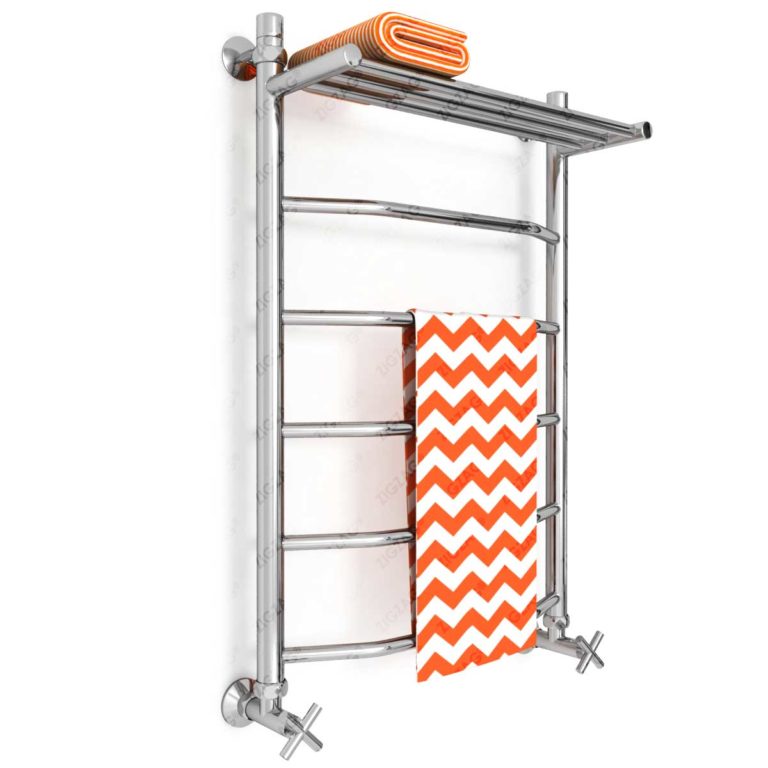 Водяной полотенцесушитель с полкой, тип лесенка. Изготовлен из нержавеющей стали, предназначен для сушки текстильных изделий или иных предметов, обогрева ванных, душевых комнат и других помещений. Подключается к системе гвс или отопления. Варианты подключения — нижнее, боковое, по диагонали. Размеры указаны по подключению.
