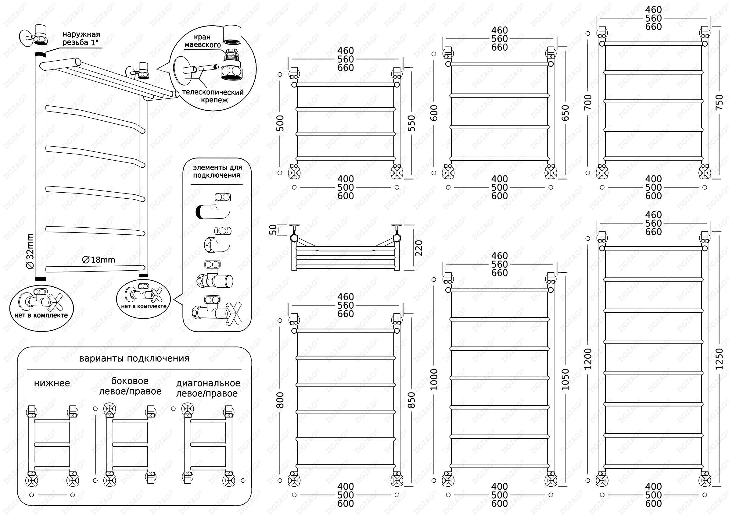 Входит в комплект полотенцесушитель, упаковка (карт. коробка, полиэт. пакет), паспорт на изделие (гарантийный талон), фитинги: колпачок декоративный — 2 шт, клапан «Маевского» — 2 шт, муфта с поворотным кольцом — 2 шт, уплотнительное кольцо G 1/2” — 2 шт, гайка накидная G 1” — 2 шт, уплотнительное кольцо G 1” — 2 шт, кронштейн телескопический — 2 шт.