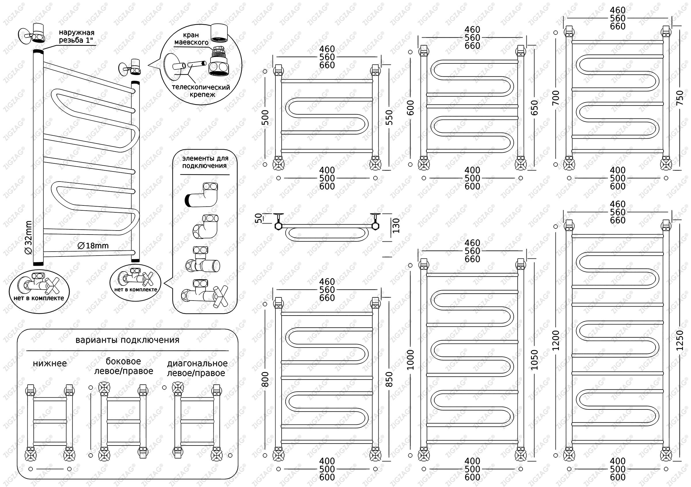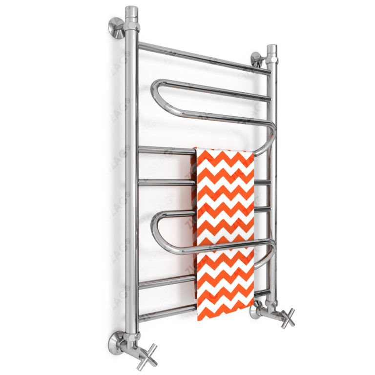 Водяной полотенцесушитель, тип лесенка. Изготовлен из нержавеющей стали, предназначен для сушки текстильных изделий или иных предметов, обогрева ванных, душевых комнат и других помещений. Подключается к системе гвс или отопления. Варианты подключения — нижнее, боковое, по диагонали. Размеры указаны по подключению.
