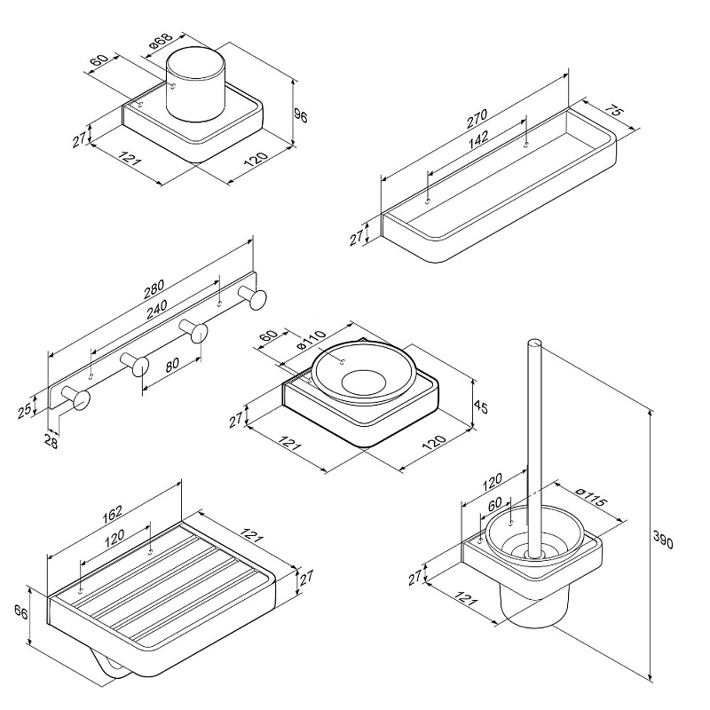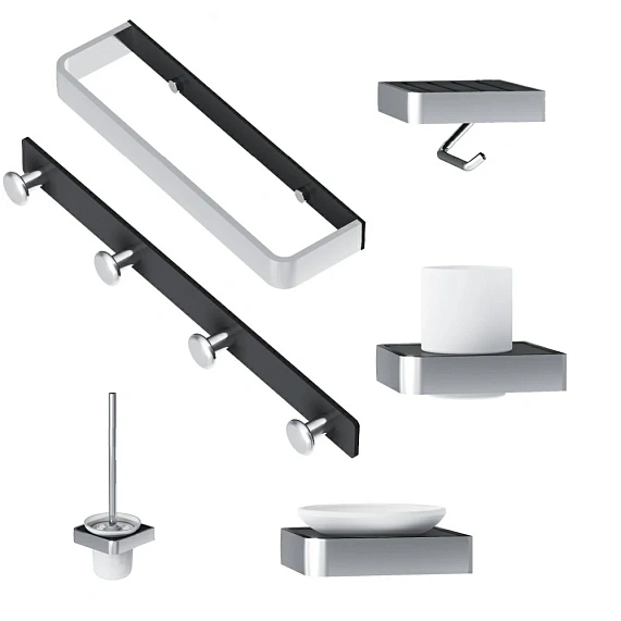 Полный набор аксессуаров для зоны красоты и туалета от Damixa выделяется изысканным скандинавским дизайном и массивным профилем. Занимая минимум места в пространстве, аксессуары Jupiter созданы для того, чтобы самое необходимое всегда было под рукой. В комплекте: стеклянная мыльница, стеклянный стакан, набор крючков для полотенец, кольцо для полотенец, держатель для туалетной бумаги, стойка с туалетной щеткой. Аксессуары Jupiter идеально сочетаются между собой и легко комбинируются с другими продуктами бренда. Широкий профиль из алюминия позволяет тратить намного меньше времени на уборку.