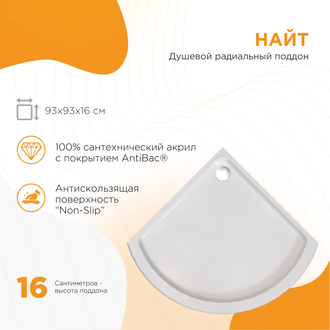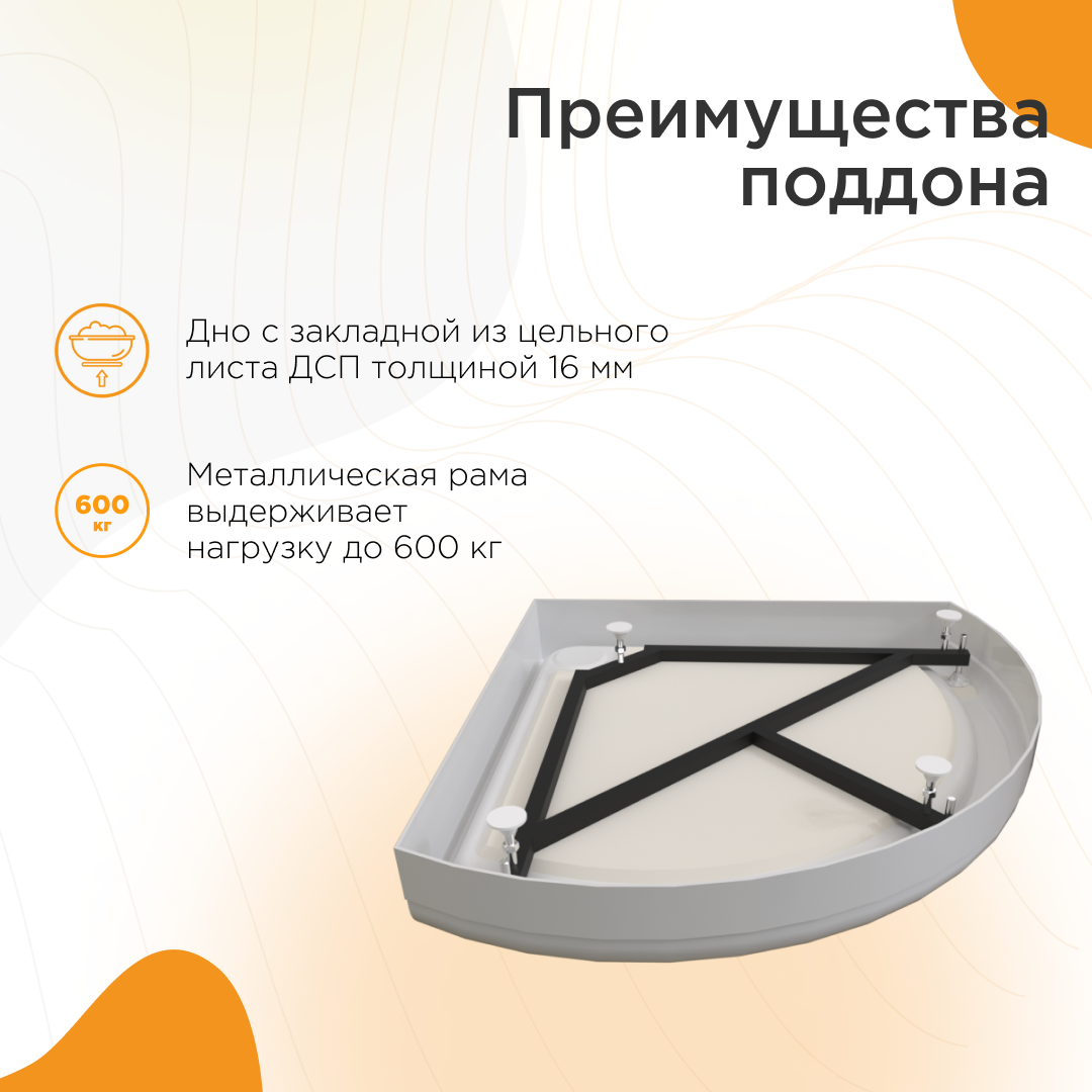 Материалом для поддона служит высококачественный сантехнический акрил, который прекрасно выдерживает ежедневную эксплуатацию. Поддон устанавливается на металлический каркас, что обеспечивает надежность и устойчивость конструкции.