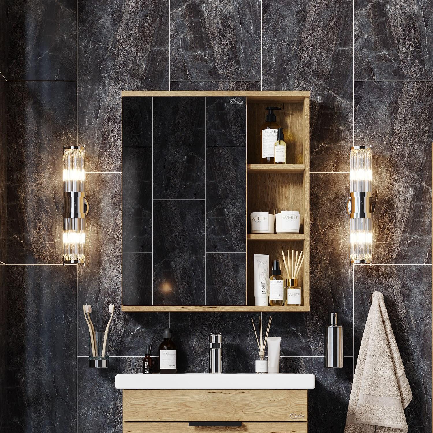 Зеркальный шкаф Onika ЛЕГРАН 50 - это безупречное сочетание красоты и функциональности. Роскошная текстура и натуральный цвет дуба подарят помещению дыхание природы и привнесет в ванную комнату ощущение гармонии. Открытые полки обеспечивают быстрый доступ к часто используемым аксессуарам, а пространство за распашной зеркальной дверцей с механизмом плавного закрывания, разделенное полочкой, станет удобным местом для хранения различных бытовых принадлежностей. Зеркальное полотно создано на основе серебряной амальгамы, которая обеспечивает качественное изображение, влагостойкость и долгий срок эксплуатации. Шкаф имеет универсальную ориентацию: верх и низ шкафа можно менять местами, а дверца может открываться как влево, так и вправо. Шкаф-зеркало выполнен из ЛДСП, устойчивой к механическим воздействиям, перепадам температур и высокой влажности. Подвесы для крепления шкафа - в комплекте. Габариты изделия 50x16x70 см. Гарантия 2 года.