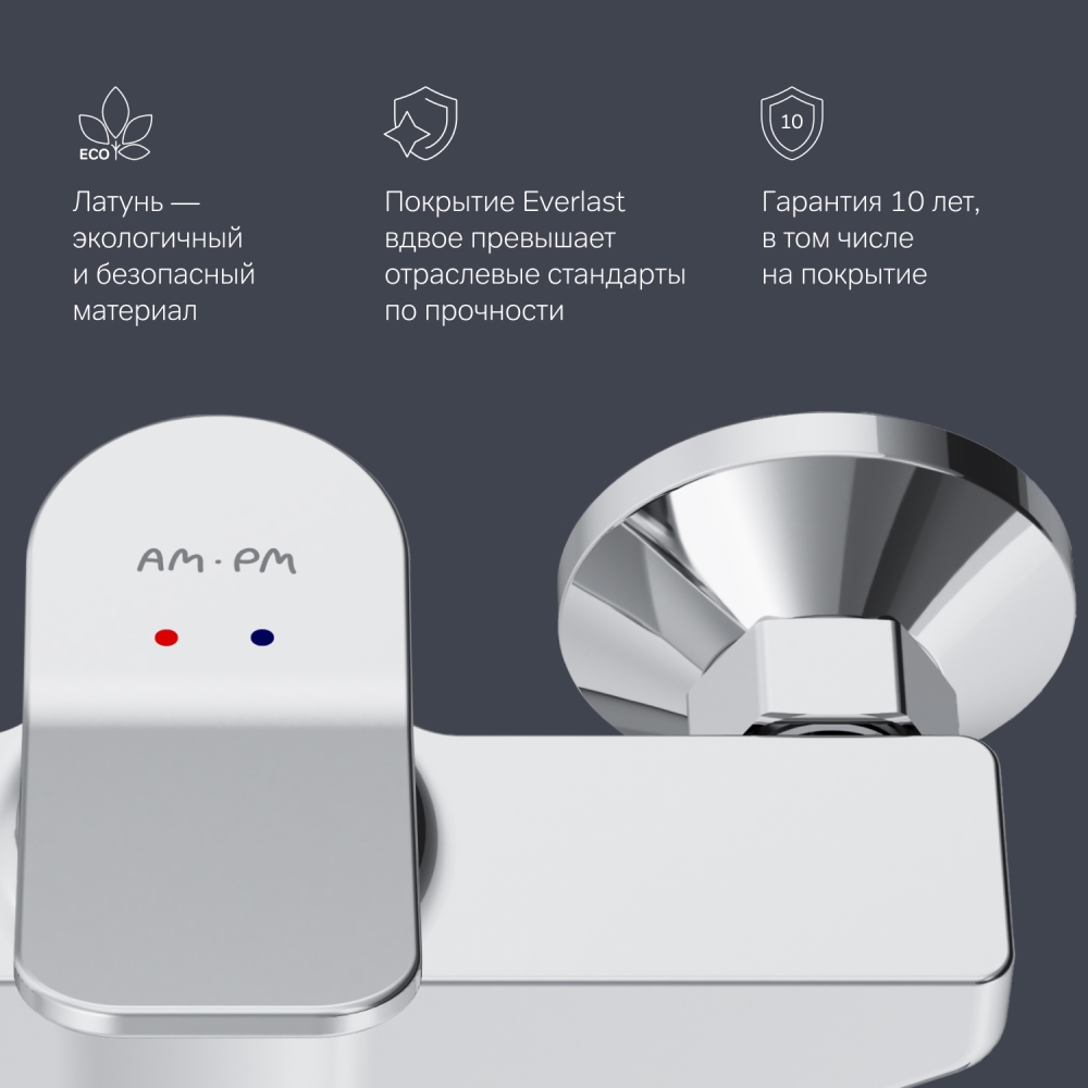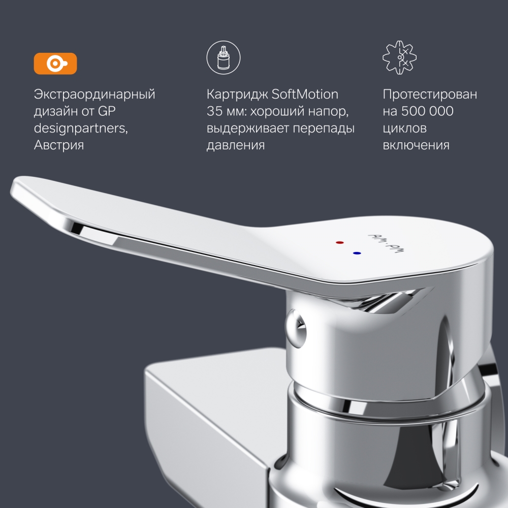 Смесители X-Joy были созданы для того чтобы задавать новые стандарты и радовать вас каждый день! Ультрамодный дизайн ручки придает смесителю дополнительную динамику и дарит непревзойденную легкость управления. Вы почувствуете это с первого прикосновения. Смеситель X-Joy оборудован специально спроектированным для AM.PM керамическим картриджем SoftMotion 35 мм который обеспечивает оптимальную регулировку температуры а также позволяет выдерживать любые перепады давления. Корпус смесителя X-Joy изготовлен по принципу цельного литья из латуни. Покрытие Everlast – вдвое превышает отраслевые стандарты по прочности и износостойкости. Ювелирный блеск и прочность покрытия достигаются по стандарту Chrome plating standard NSS 80H. Отдельная гарантия на корпус и покрытие – 10 лет в два раза больше чем принято по европейским стандартам. ""