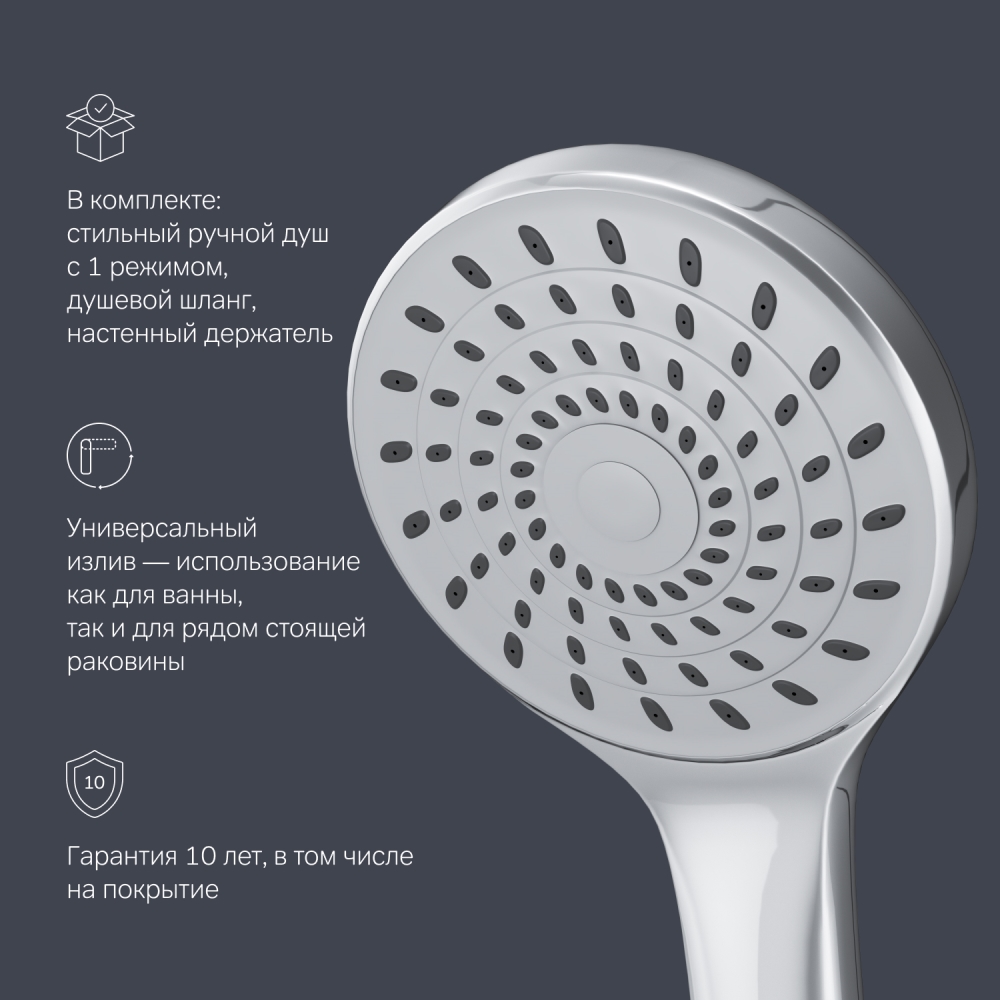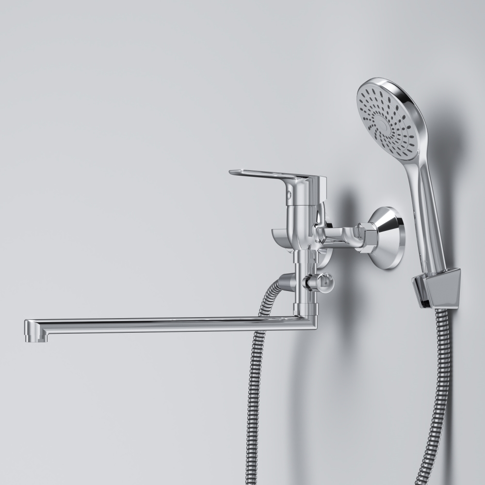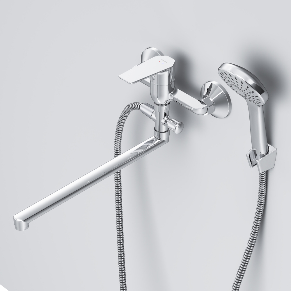 Стильное универсальное решение для ванной комнаты - качественный смеситель для ванны и душа с длинным поворотным изливом с душевым набором. Универсальный длинный излив позволяет ипользовать смеситель как для ванны так и для рядом стоящей раковины. Функциональный держатель для ручного душа на два положения добавит удобства использования. Душевой шланг длиной 150 см позволит наслаждаться душем даже высокому человеку. Максимум функций за разумную плату в одном изделии! Ультрамодный дизайн ручки придает смесителю дополнительную динамику и дарит непревзойденную легкость управления. Вы почувствуете это с первого прикосновения. Точная инженерия для Вашего комфорта: благодаря обширной зоне движения ручки управлять температурой воды стало еще проще. ""