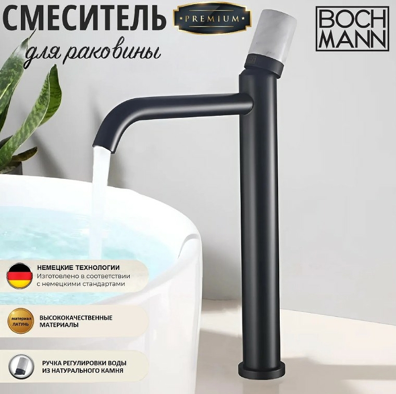 Смеситель STELLA Stone B XL для раковины, с ручкой из НАТУРАЛЬНОГО КАМНЯ, цвет черный, высокий BOCH MANN BM9971 - идеальное решение для современной ванной комнаты.
