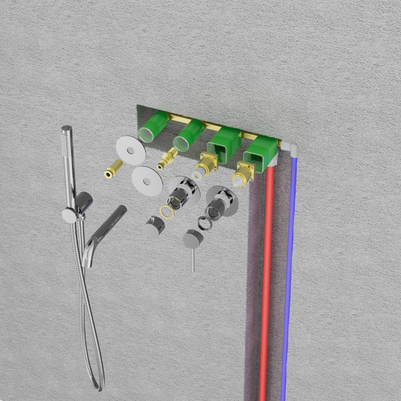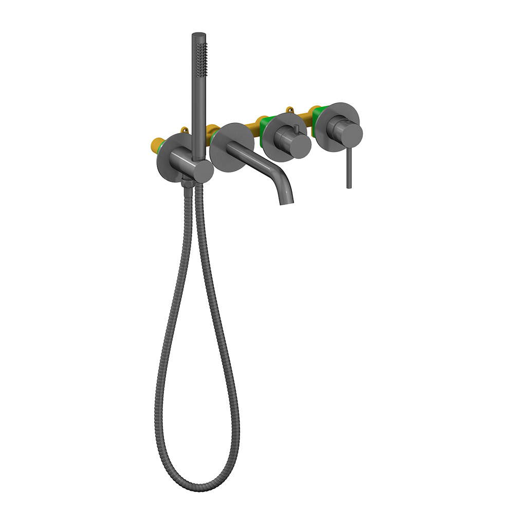 Встраиваемый смеситель Timo Saona 2314 предназначен для монтажа в твердой или полой стене. Уникальная дизайнерская модель с раздельными горизонтальными блоками, создаст неповторимый современный интерьер в ванной комнате. Основные преимущества встроенного смесителя: коммуникации, крепления и механизмы спрятаны в стену и видны только декоративные элементы, установить встроенный смеситель можно в любом месте. Стильная лейка-карандаш удобна в использовании и фиксируется в держателе с подключением душа. Регулировка температуры и напора воды осуществляется джойстиком справа. Переключение потока воды с излива на ручную лейку осуществляется поворотом ручки дивертора. Сложностей монтажа не возникает при установке смесителя опытным сантехником. Внимательно изучите инструкцию по монтажу и эксплуатации. Цвет "черное золото" не капризен в уходе, на нем менее заметны загрязнения и мелкие царапины.