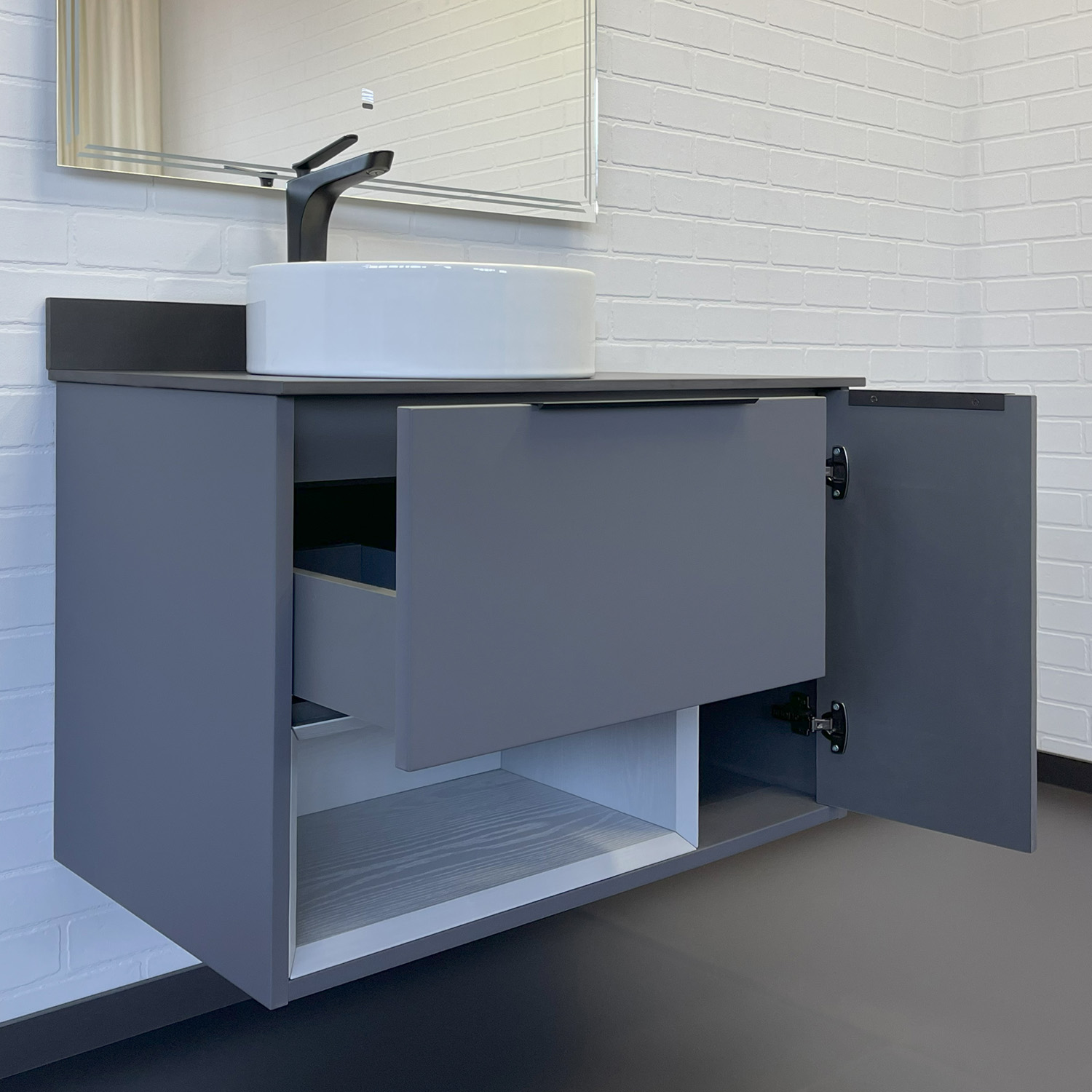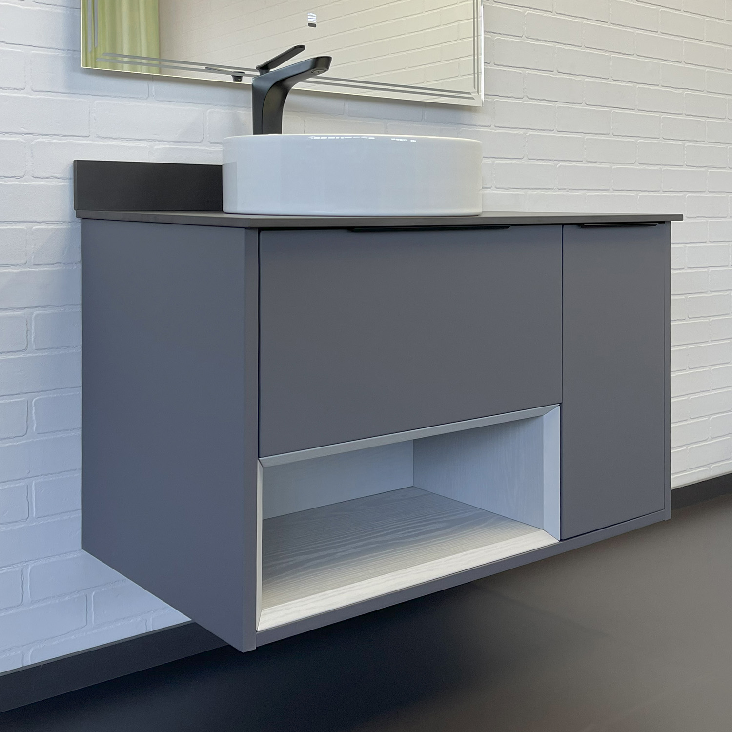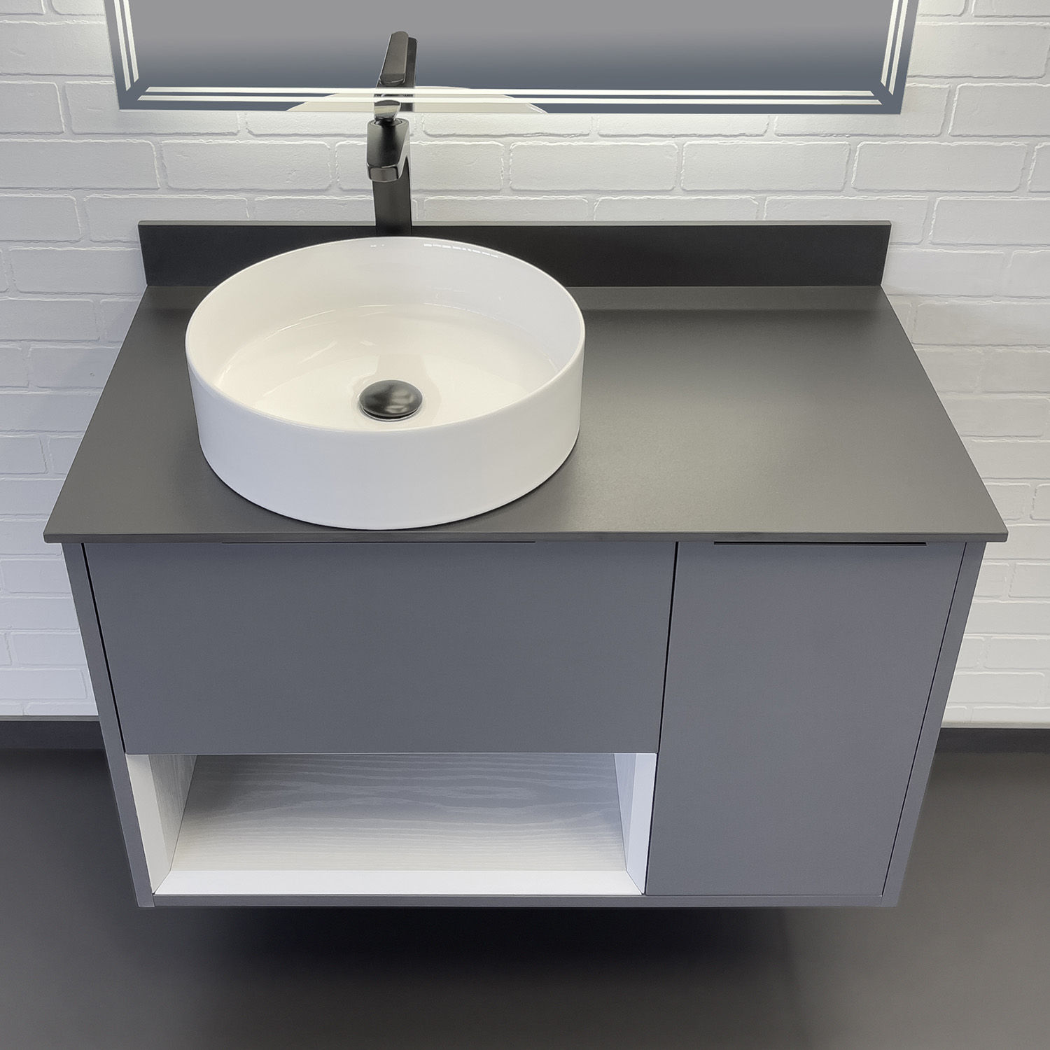 Дополнительная информация Торговая марка: Comforty Название: Тумба-умывальник Артикул: 00-00017878CF Варианты цвета корпуса: Антрацит/Серый матовый Материал корпуса: влагостойкое ЛДСП Цвет фасада: Антрацит Материал фасада: МДФ Габариты (ШхВхГ): 900*672*500 мм Комплектация: круглая керамическая раковина Comforty 9111 Подвесная тумба с одним ящиком и створкой оборудованными системой плавного закрывания. Предусмотрено пространство для открытого хранения. На фасадах тумбы черные матовые алюминиевые ручки. Прямоугольная раковина-чаша установлена на столешницу из керамогранита. В комплекте также пристенный плинтус. Ниша открытого хранения сделана из МДФ в пленке серого цвета с текстурой дерева. Торцы вставки спилены под углом.