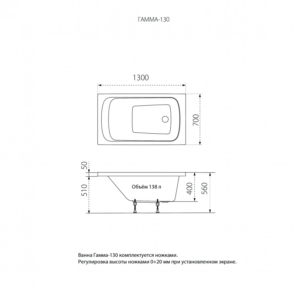 Ванна 1ACreal Gamma Стандарт, 130х70, Щ0000028715