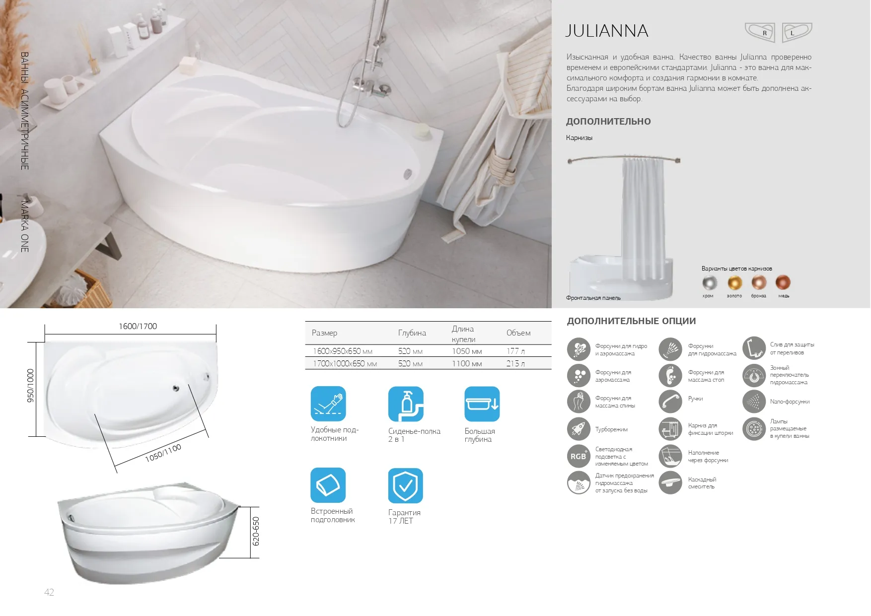 - Удобные подлокотники - комфорт при принятии ванны;