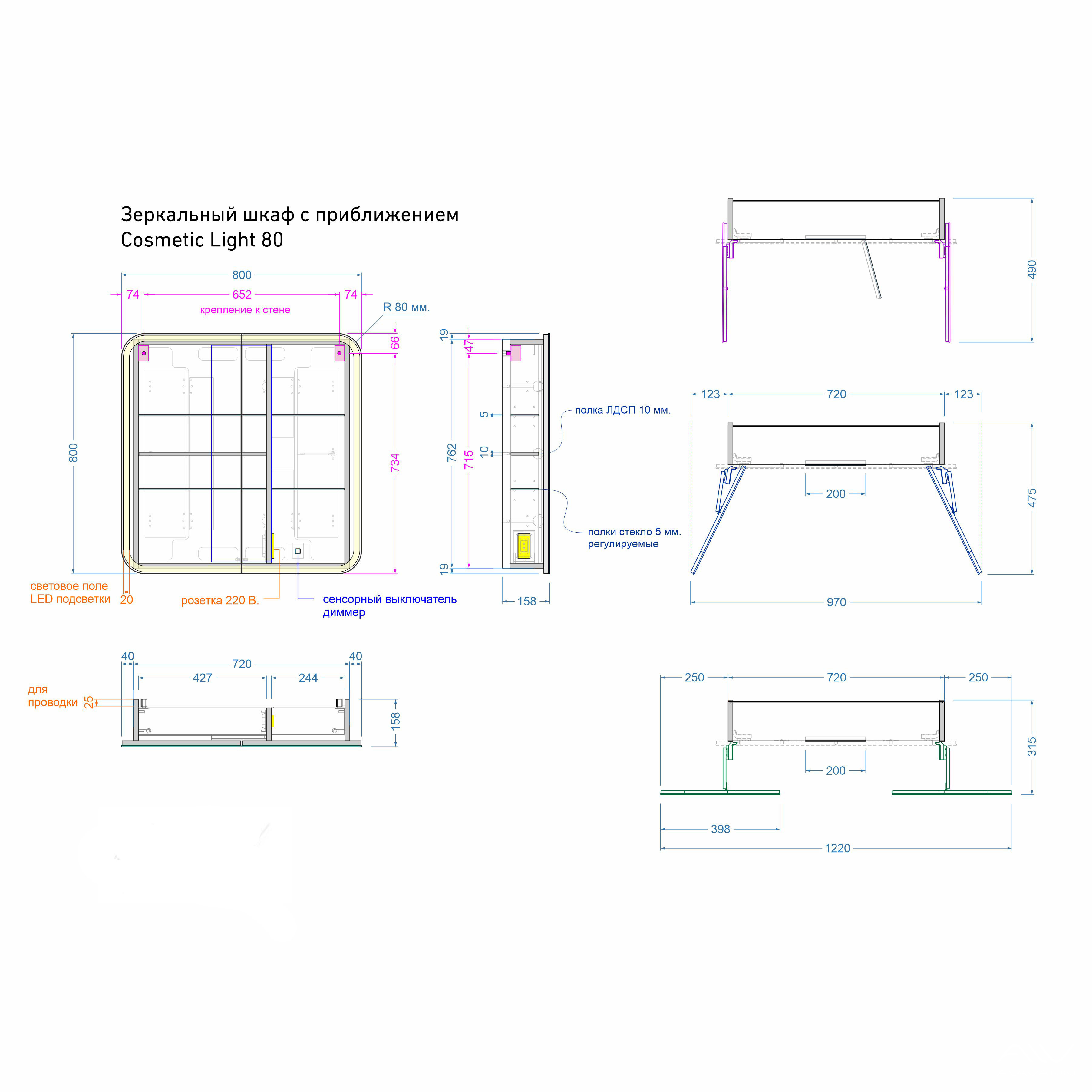 Размер навесного зеркального шкафа составляет 80х16х80 см. Материал изготовления – влагостойкая ЛДСП, которая не портится от длительного нахождения во влажной среде. Холодный свет декоративной LED ленты наполняет комнату атмосферой чистоты и свежести. Петли с доводчиками обеспечивают плавное закрытие створок и защищают их от случайного удара о корпус.